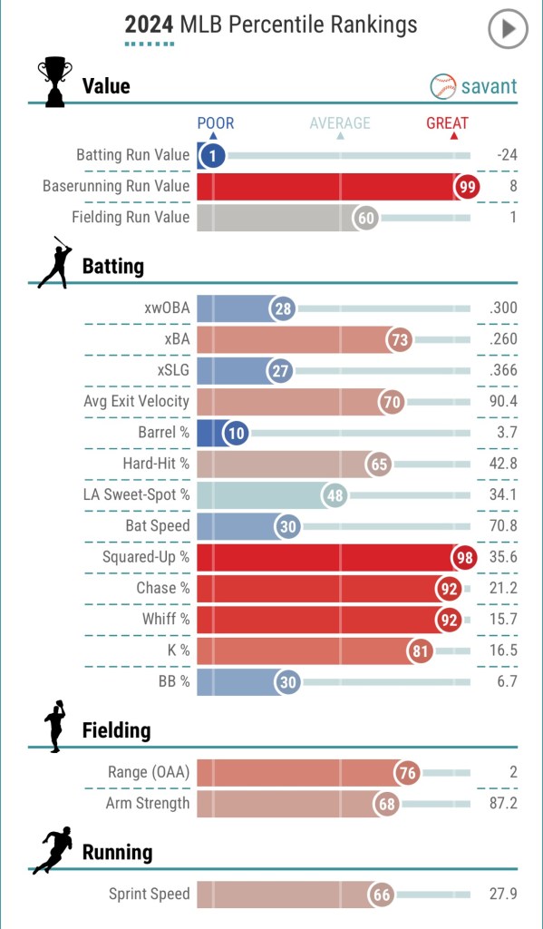 His contact batting average was much worse in 2024 (.281) than it was in 2023 (.361). To his credit, he turned up his play in the postseason hitting .318 and being a catalyst on the basepaths.