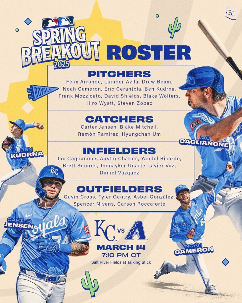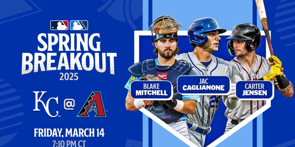 Spring Breakout is a four-day event showcasing baseball’s future: the current stars of Minor League Baseball. It’s held from March 13-16 at Grapefruit and Cactus League ballparks during Spring Training. Sixteen exhibition games will be played between teams comprised of each MLB organization’s top prospects. Royals’ Minor Leaguers will face the D-backs’ Minor Leaguers on March 14 at 7:10 p.m. CT in Scottsdale, Ariz.