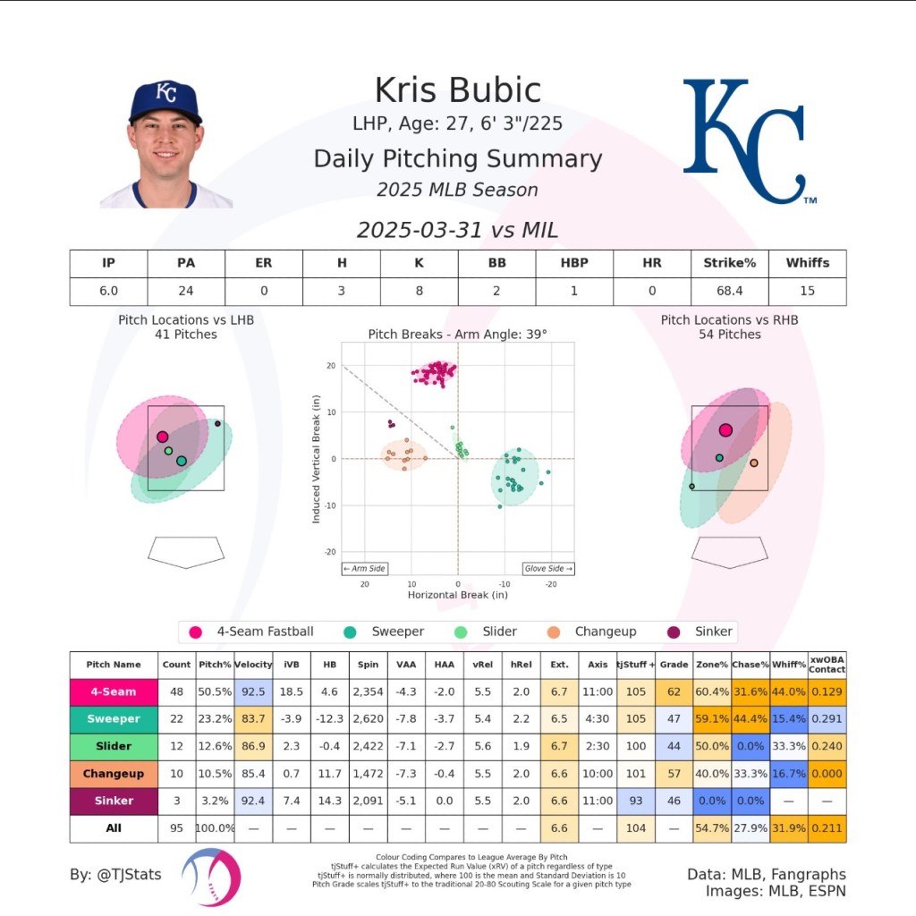 This is a great development for Bubic, who could really make a difference for this Royals rotation. The Royals’ front line starters have got off to cold starts. Having a pitcher like Bubic at the end of your rotation is a luxury. He’s never been a high strikeout guy, but he might be now. His fastball velocity is at its peak right now. He’s using his changeup less but added velocity to it (28% usage-80.7 mph in 2022; 17% usage 85.2 mph in 2024). He also scrapped his Curveball for a Sweeper and it was his second-most used pitch on Monday.