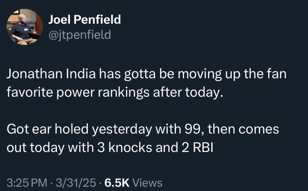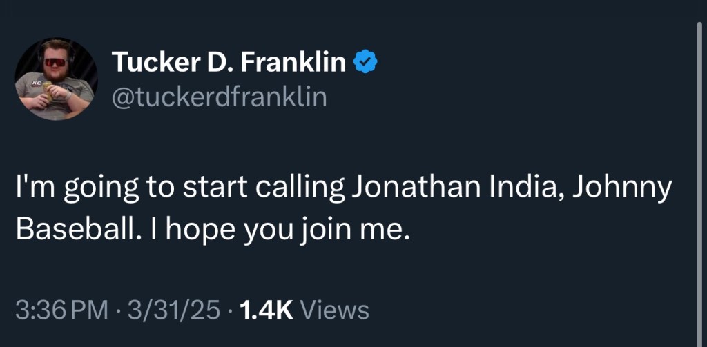 But let’s have a chat about Jonathan India shall we? I think I’m about to fall in love with this white man. He took a 100 mph fastball to the dome against the Guardians on Sunday, but found a way to make it in the lineup against the Brewers. I wasn’t sure if we were going to see him for a while after the Royals said they would take a couple of days to evaluate him. Apparently the evaluation was a waste of time because he had arguably the best day of anyone at the plate.
