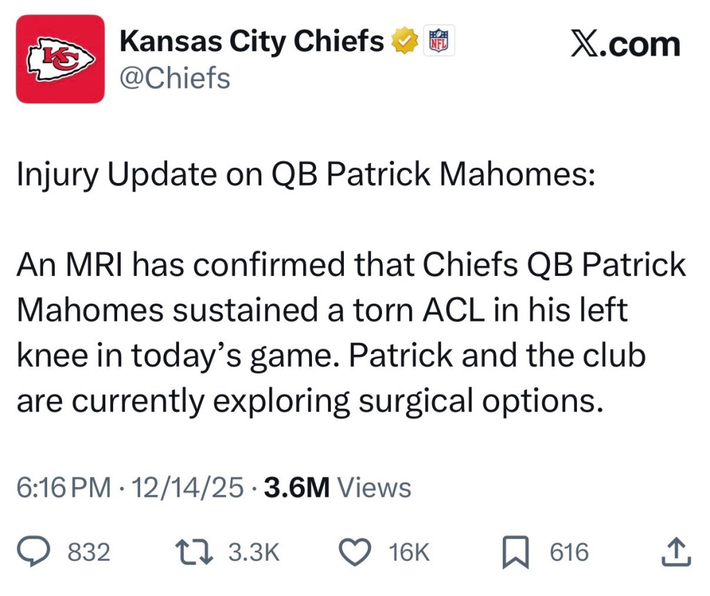 It also ended Patrick Mahomes’ season prematurely; three hours after game time, it was announced that he had torn his ACL. Obviously, your heart goes out to Mahomes, who always leaves his guts on the field.